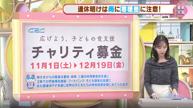 CBCチャリティ募金2025の受付は終了いたしました。皆さまからお寄せいただいた募金総額は、1528万2739円(12月22日集計)となりました。皆さまからの募金は愛知・岐阜・三重の共同募金会を通じ3県下の児童福祉施設・フードバンク・子ども食堂の支援に、また国連WFPを通じ世界の子ども達の学校給食支援などに役立てさせていただきます。