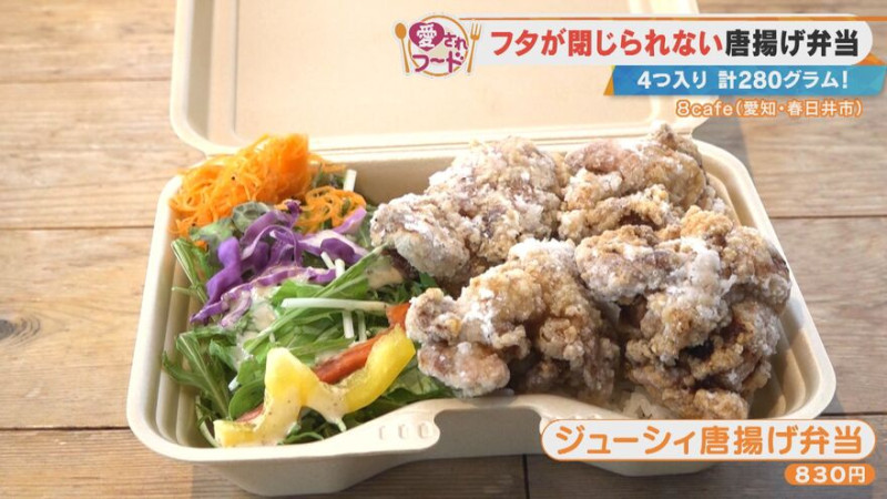 こちらが、食べなきゃ損する『ジューシィ唐揚げ弁当』!1つ70gの唐揚げが4個、合計なんと280gというボリューム。これでまさかの830円と驚きのコスパです。衣はカリカリ、中はジューシーな巨大唐揚げは、地元の女性を中心とした若い世代に大人気。お店では、温玉つきの『ジューシィ唐揚げ丼』として楽しめます。