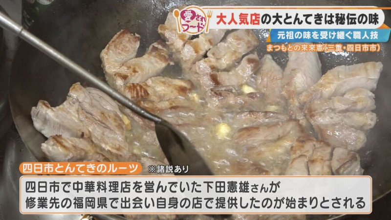 “四日市とんてき”のルーツは、今から70年ほど前の昭和20年代にさかのぼります。地元で中華料理店を営んでいた下田さんが、修業先の福岡県で出会った料理を四日市に持ち帰ったのが始まりとされています。※諸説あり
