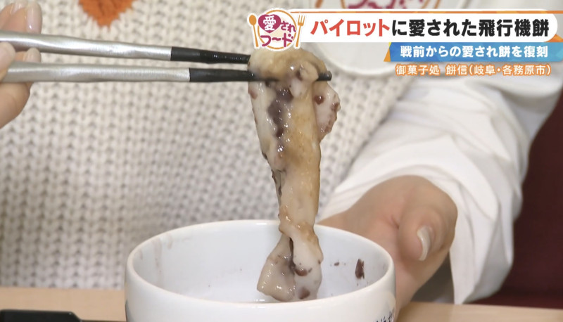こちらの名物が「飛行機餅」。プロペラみたいな焼き印がついた、なんとも可愛らしいお餅です。各務原航空自衛隊基地が、まだ飛行試験場だった100年前に、旧陸軍のパイロットや職員が飛行場で食べていたという大福餅。その兵隊さんたちから「飛行機餅」と呼ばれ愛された、銘菓の復刻版です。