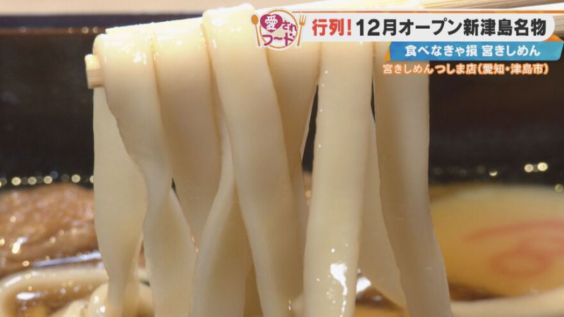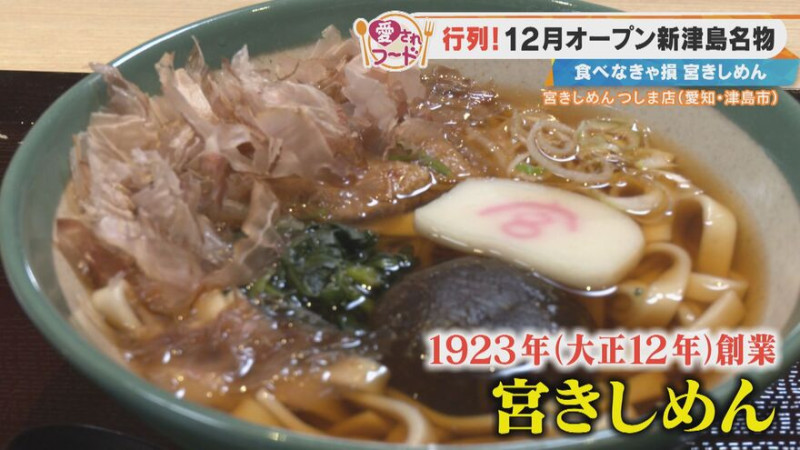 続いて訪れたのは、「宮きしめん つしま店」。熱田神宮にある1923年創業の老舗「宮きしめん」の新店舗で、2025年12月に津島神社の隣にオープンしました。名古屋めしを代表する「宮きしめん」や、土鍋で味わう「親子みそ煮込きしめん」などがそろいます。