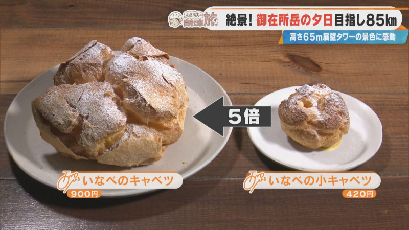 お腹を満たした後は、まち自慢を聞き込みます。すると再び、こんま亭のシュークリームが!しかし、いなべ市にあるこんま亭は、御在所へ向かうルートからは大きく外れてしまうため、今回は断念!大人気のシュークリーム「いなべのキャベツ」は、まさしくキャベツのような大きさで賞味期限は約5時間の特別なスイーツ。通常サイズに比べると大きさは約5倍で、名前の由来はフランス語の「シュークリーム=クリーム入りキャベツ」。甘さ控えめのカスタードと生クリームを使用した濃厚な味わいとのこと。
