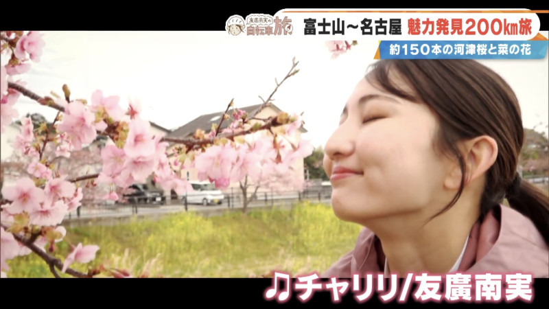 友廣アナは、前回立ち寄った公園でオススメされた河津桜を発見。「きれいなピンク色です!菜の花も見頃を迎えていますね。黄色とピンクのコントラスト!めちゃくちゃ映えてる!」と自転車を降ります。