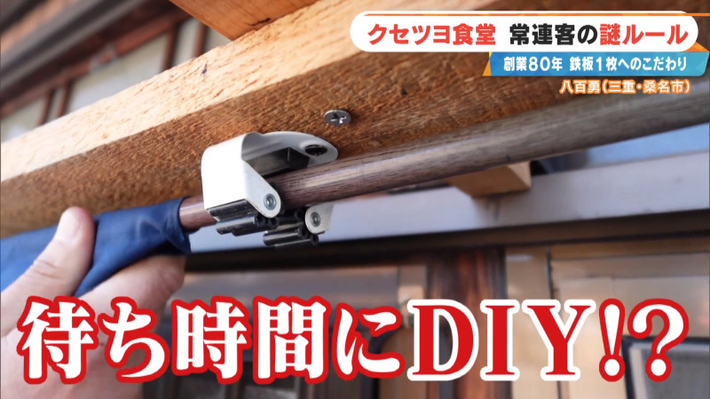 さらに、週3回通う年季の入った常連客ともなると、待ち時間の過ごし方もひと味違います。お好み焼きの待ち時間に、お店の“のれん”を引っかけるアタッチメント付きの「のれん掛け」をDIYで作成。