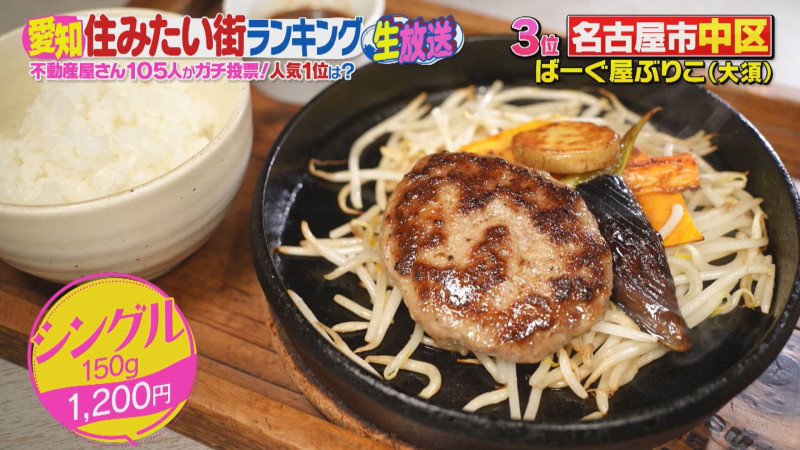 板谷さんオススメの中区グルメは、大須商店街東仁王門通にある開店10周年のハンバーグ専門店「ばーぐ屋ぶりこ」の「鉄板ハンバーグ」。オーストラリア牛と国産豚の合いびき肉を使ったハンバーグで、オリジナルごましょうゆソースがご飯に合います。