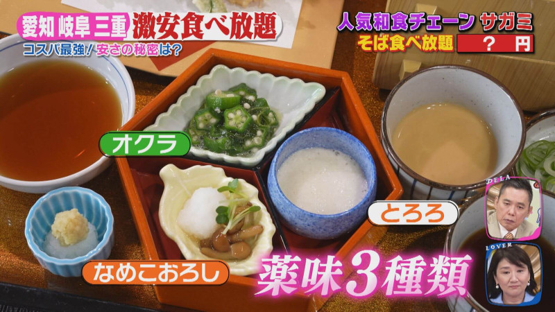 愛知県からは、和食チェーン店「サガミ」のそば食べ放題を紹介。1975年創業のサガミは、名古屋市の一社に1号店ができてから51年。東海地方を中心に全国に165店舗を展開する人気和食チェーンです。