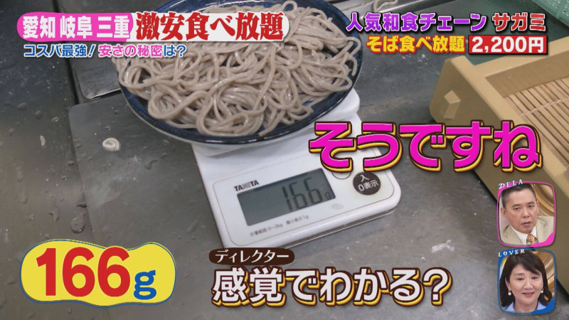 番組は、此島さんが感覚で盛り付けたざるそばが、サガミの基準160~170gにおさまっているかを検証。量ってみると166g!ひきたて、打ちたて、ゆがきたてのそばを熟練の技で素早く届けることが、サガミのそばのおいしさの秘密でした!