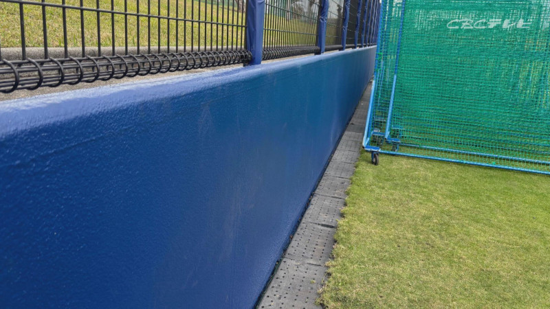 早速動いたのは、地元の北谷町だった。ドラゴンズの井上一樹監督からも要望が出されたこともあって、その動きは迅速だった。8月14日から12月19日まで5か月間をかけて、フェンスを全面的に改修した。かかった予算は9,600万円余り。張り替えた新しいフェンスには、厚みのあるウレタン素材を使用した。筆者も実際に指で押さえてみたが、極端な柔らかさはないものの、ソフトな弾力性があって、衝撃に対しては十分に効果を発揮すると実感した。色もこれまでの緑色から“ドラゴンズブルー”に替わった。