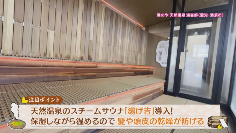 注目は、天然温泉の蒸気を全身で浴びるスチームサウナ「湯げ吉(ゆげきち)」。保湿しながら温めるため、髪や頭皮の乾燥も防げるそう。その隣には、水風呂「美ず吉(みずきち)」も新たに登場。天然温泉を冷やした水風呂は珍しいのだとか。