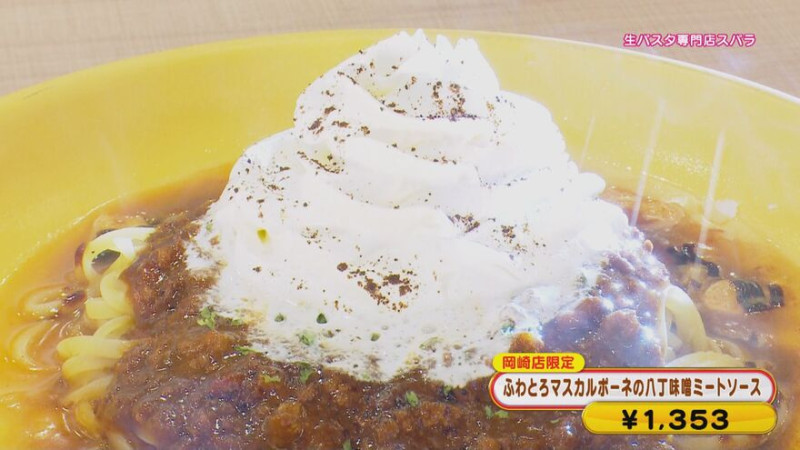 また、限定「ふわとろマスカルポーネの八丁味噌ミートソース」(1,353円)もオススメ。岡崎の八丁味噌入りミートソースに、マスカルポーネのエスプーマ、八丁味噌のパウダーをまぶした逸品です。