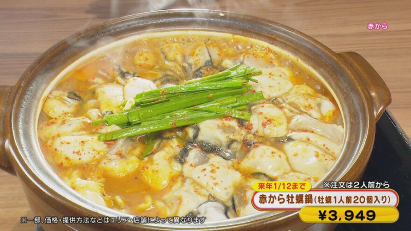 秘伝の味噌と赤唐辛子をブレンドした旨辛の鍋が名物の「赤から」。クセになる辛さが魅力の旨辛鍋が、さらにパワーアップ!牡蠣をふんだんに使った「赤から牡蠣鍋」(3,949円)が登場しました。※2026年1月12日まで。注文は2人前から。一部、価格・提供方法などはエリア・店舗によって異なります。