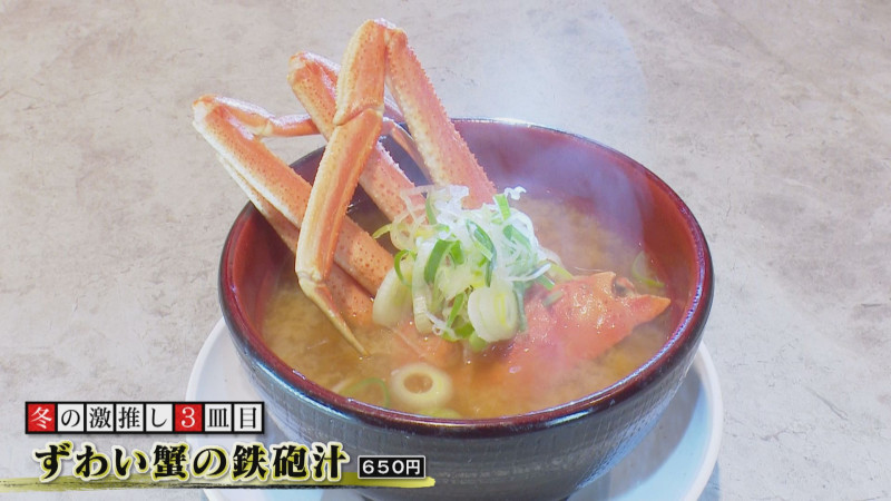 さらに、2人が「絶対に頼むべし!」というのが、北海道産ズワイガニが半身も入った「ずわい蟹の鉄砲汁」(650円)。甘みの強い北海道産の赤味噌を使用しており、カニの身はもちろん、カニの出汁が効いた濃厚な味わいが堪能できます。