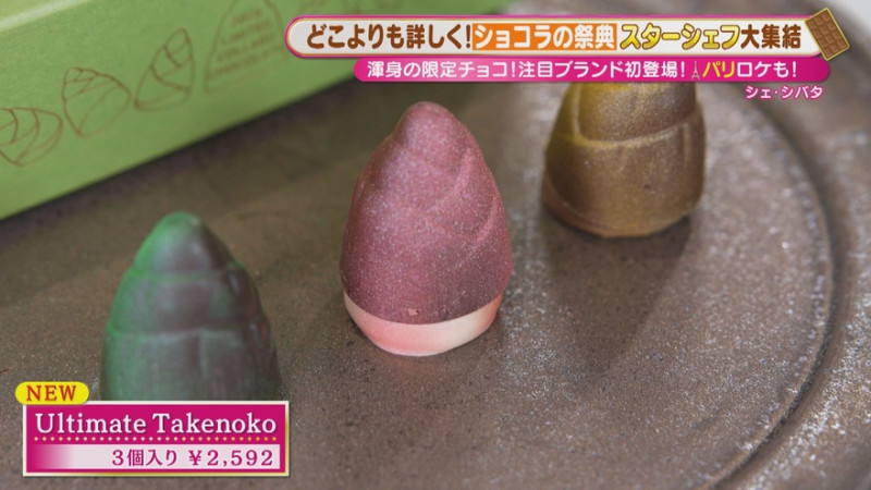 「たけのこの里」とコラボしたボンボンショコラ「Ultimate Takenoko」(3個入り 2,592円)は、イチオシのレア新作。最高級のカカオに塩抹茶を組み合わせた「ソルテド抹茶」など、スペシャルな3粒はパリでも大絶賛!