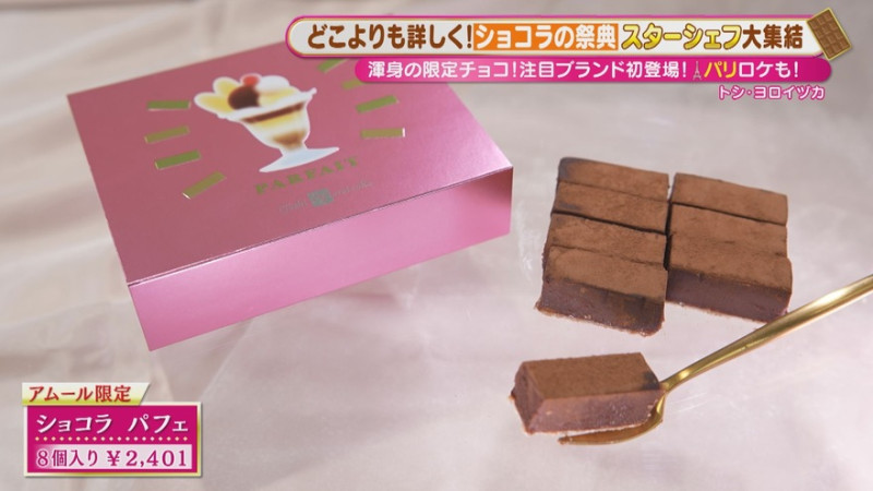エクアドルにカカオ農園を持ち、畑からのショコラ作りに挑戦し続けている鎧塚シェフは、生チョコ「ショコラ パフェ」(8個入り 2,401円)でチョコレートパフェを表現。ウエハースやバナナ、チェリーがこの1粒で感じられ、鎧塚シェフの夢と原点が詰まっています。