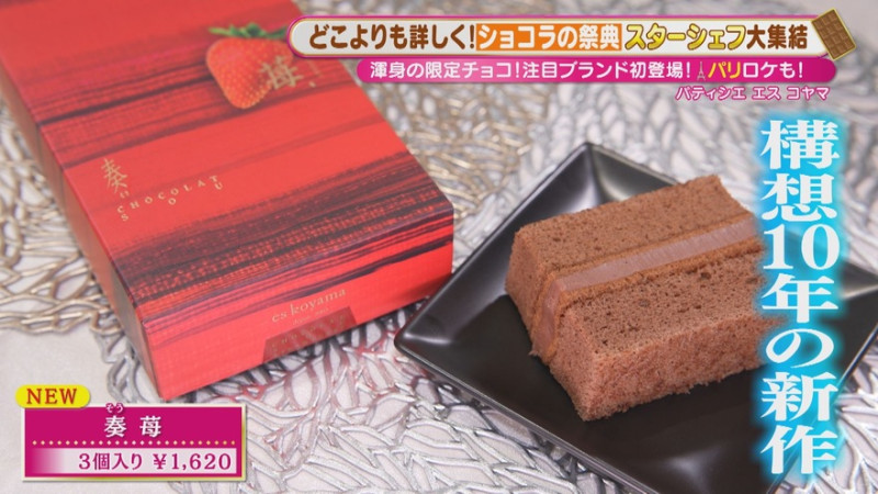 イチオシは、新作「奏(そう) 苺」(3個入り 1,620円)。しっとりとしたチョコレートのスポンジでミルクチョコレートのガナッシュをサンドした定番商品「奏」の“苺味”は、パンチの強いヨーロッパの苺に、センガセンガナ種を使うことで実現。構想10年という渾身の限定品です。