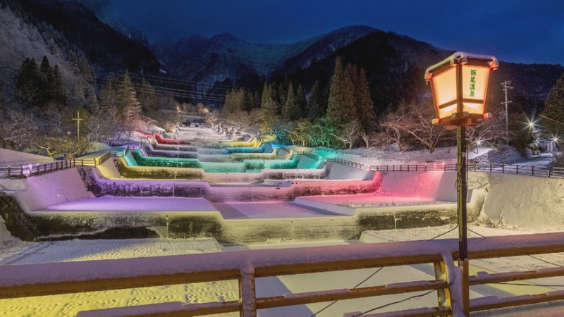 岐阜県高山市の栃尾(とちお)温泉で開催中の「洞谷(ほらだに)雪桜ライトアップ」は、積もった雪がカラフルなライトに照らされて幻想的。※2月末まで