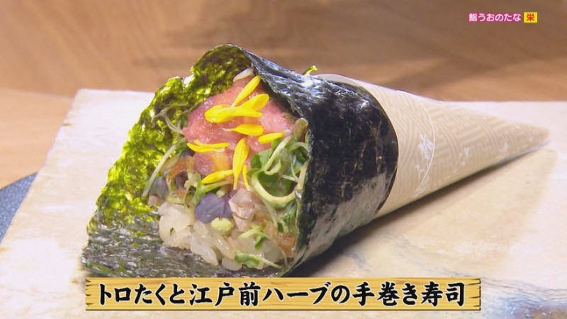 赤酢のシャリで握る寿司は、看板メニューの「トロたくと江戸前ハーブの手巻き寿司」をはじめ、旬のサワラや昆布締めにした真鯛など、こだわりのネタばかり。中でも、30分かけて蒸した岐阜県産のシイタケは、シャリの赤酢とも相性抜群!