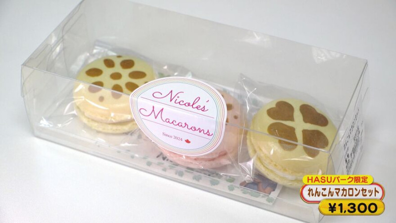 また、生鮮食品だけではなく、名物のレンコンを使ったスイーツも。地元のマカロン工房で作られた「れんこんマカロンセット」(1,300円)は、「HASUパーク」限定商品。黒糖・いちご・ゆずの3種類のフレーバーがセットになっており、クリームの中には砂糖漬けのレンコンが入っています。