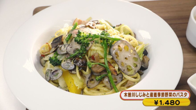 中でもオススメは、「木曽川しじみと産直季節野菜のパスタ」(1,480円)。醤油をベースに、炒めたレンコンや素揚げしたレンコンがたっぷり!もちもちの生パスタを使用しており、木曽川でとれたしじみの風味と旨みがたまりません。