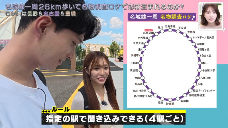 今回2人が挑むのは、名城線一周・26km歩いて名物を探す調査ロケ。街の人に聞き込みをして6つの名物を見つけられたらクリアです。指定された4駅ごとにしか聞き込みできないというルール。