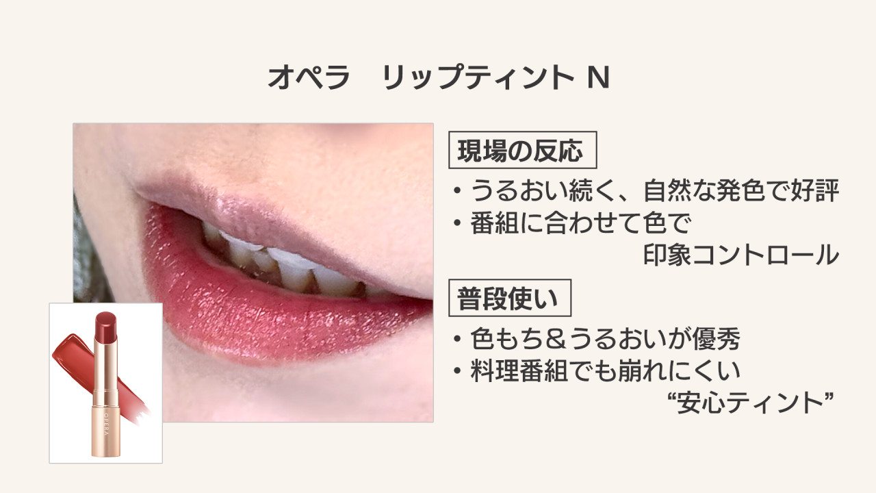 唇が渇きやすいアナウンサーの仕事においても、オペラのティントを使用している日は、カメラ越しでもうるおい感が伝わるとのこと