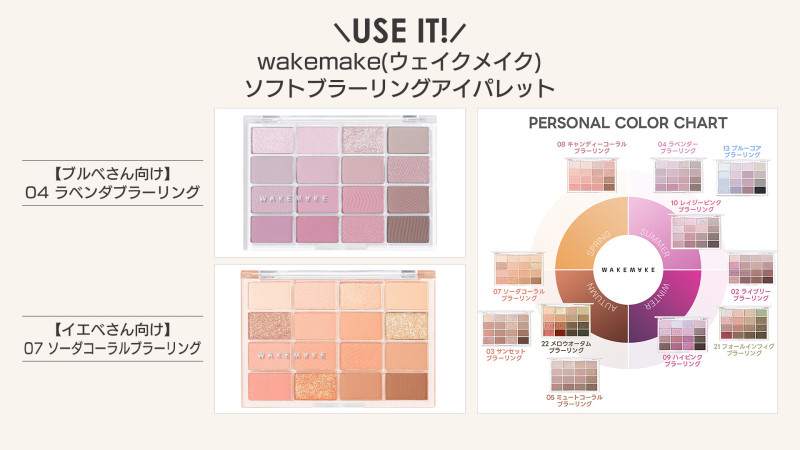 「どれを選べばいいかわからない…」という方には、パーソナルカラー別に展開されているwakemakeのパレットが頼れる存在。マットからラメまでそろっているので、シーンに合わせて幅広く活用できます。