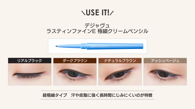 ヘアメイクさんがメイク室で使っているのは、デジャヴュの「ラスティンファインE 極細クリームペンシル」。超極細タイプで、汗や皮脂に強く長時間にじみにくい※のが特徴です。ただ、にじみにくい※分、メイクオフの際は少し丁寧に落とす必要があります。