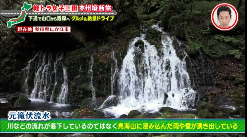 三田は、「景色のいい場所があるみたいだから、ちょっと寄ってみようっと」と観光を楽しむことに。立ち寄ったのは、にかほ市にある「元滝伏流水(もとたきふくりゅうすい)」。車を停め、川沿いを歩いていくと…
