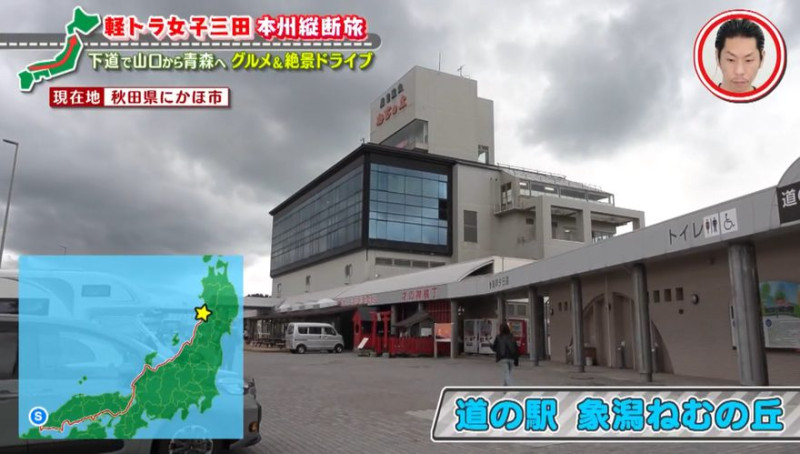 「元滝伏流水」をあとにした三田は、「秋田のおいしい名物いっぱい食べよっと」と、休憩することに。にかほ市にある東北最大級の道の駅象潟(きさかた)「ねむの丘」に立ち寄ります。