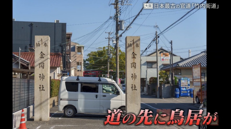 さらに奈良方面へ進み、仁徳天皇陵を抜けて大泉緑地の近くへ。駐車場の中に「金岡神社」と書かれた石柱があり、「おそらくこの駐車場は、竹内街道から分かれる参道だったと思う」と道マニアは言います。