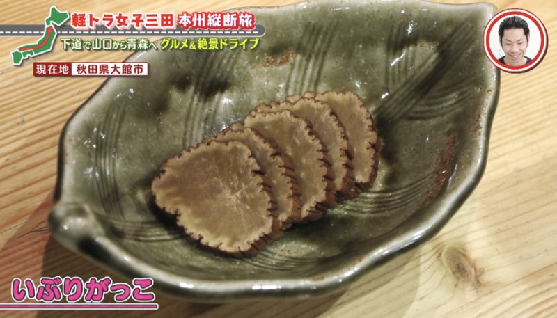 続いては、秋田の代表的な郷土料理「いぶりがっこ」をいただく三田。見た目が「卵焼きみたい」と口に運ぶと…