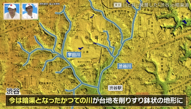かつて渋谷駅周辺を流れていた「渋谷川」と、その支流「宇田川(うだがわ)」。ともに現在は地下を流れる暗渠となっていますが、この2つの川が台地を深く削り取ったことで、渋谷は坂道に囲まれたすり鉢状の地形になっています。