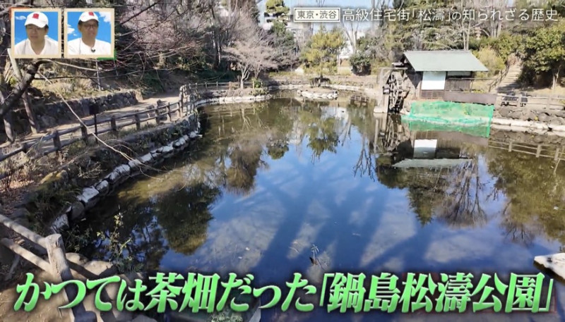 かつて茶畑だった「鍋島松濤公園」には池があり、そのほとりには水車小屋があります。狭い谷筋に水が集中する渋谷川とその支流は水流も強く、水車が効率良く回ったため、かつて50近くの水車があったそう。