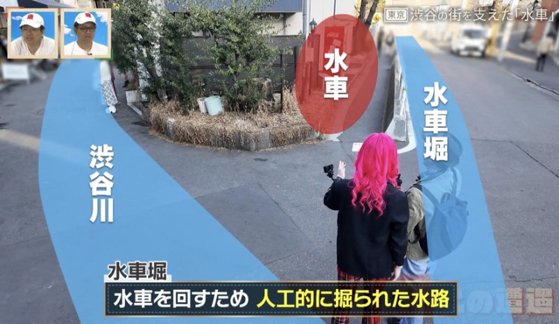 「ここには“村越の水車”と呼ばれる大きな水車があった。渋谷川を分岐させて人工的に掘られた水路で水車を回していた」
