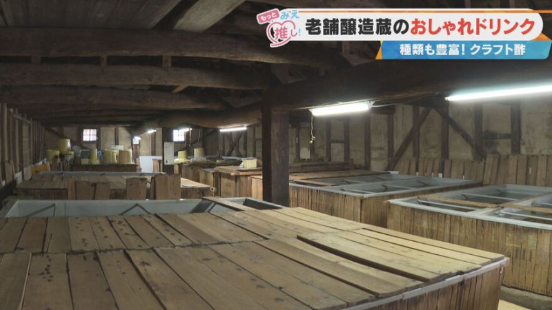蔵に並ぶ大きな桶で、野菜や果物を発酵させて作ったお酒に酢酸菌を加えて酢酸発酵を行い、お酒をお酢に変えています。