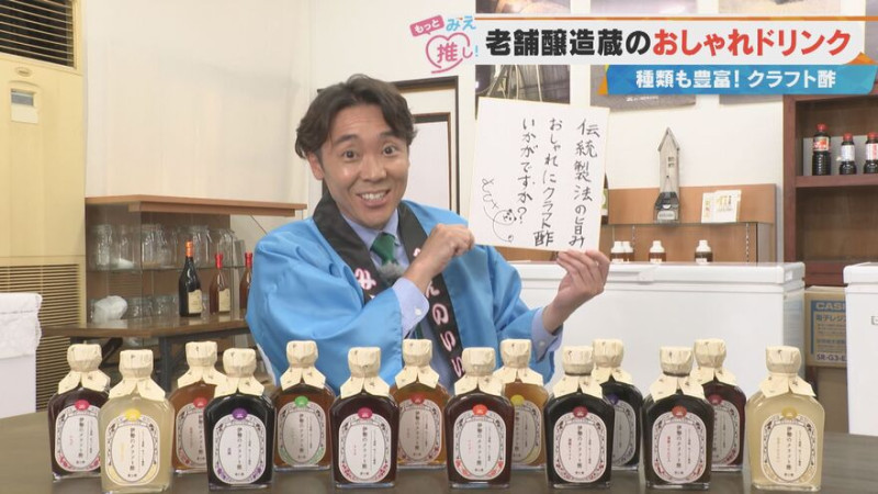 よしお兄さんが飲んだドリンクは、リンゴを発酵して作ったリンゴ酢をベースに、ショウガとゆずを加えたもの。「伊勢のクラフト酢」は、他にも黒酢・トマト酢・ブドウ酢をベースに作られていて全14種類を展開しており、どれも口当たりがまろやかでやさしい味が特長です。