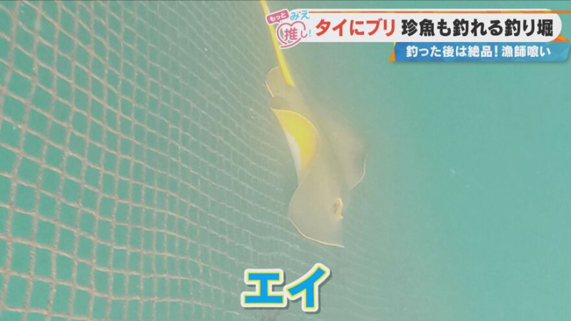 この釣り堀の最大の特徴は“多様性生簀”。多様性をうたうだけあって、釣りやすい魚が入っているとは限りません。よしお兄さんが挑戦した日は残念ながら釣れませんでしたが、釣り堀にはなんとエイが泳いでいました!他にもサメなど、その時々で獲れた珍しい魚を釣ることができるのが大きな魅力です。