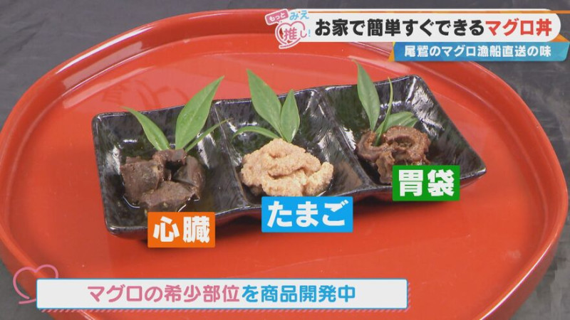 さらなる商品化に向けて、マグロの希少部位である心臓、卵、胃袋を常温で食べられるように開発中。試作中の心臓を試食したよしお兄さんは「生臭さをあまり感じないですね」と驚きの声を上げました。