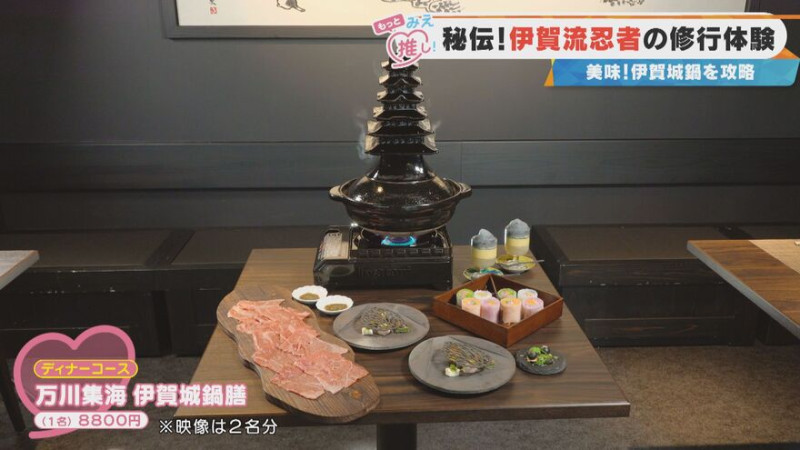 体験施設の4階にはレストラン「伊賀忍者饗膳」も併設されており、ここでしか味わえない特別な料理が楽しめます。テーブルに運ばれてきたのは、まるでお城のような形をした巨大な鍋!