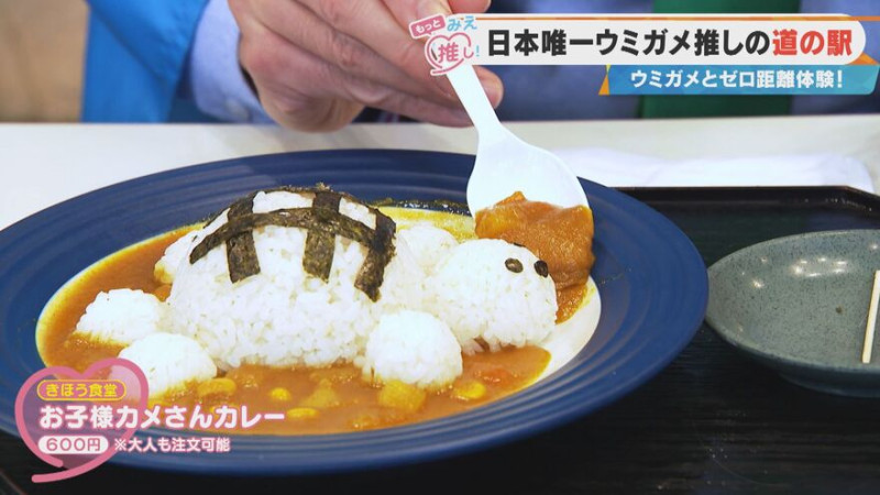次なる推しポイントは「ウミガメグルメ」。水族館に隣接するレストランでは、ウミガメをモチーフにしたかわいらしいメニューが楽しめます。スタッフが運んできたのは「カメさんカレー」!ライスでカメの形をかたどった、見た目にもインパクト抜群の一品です。