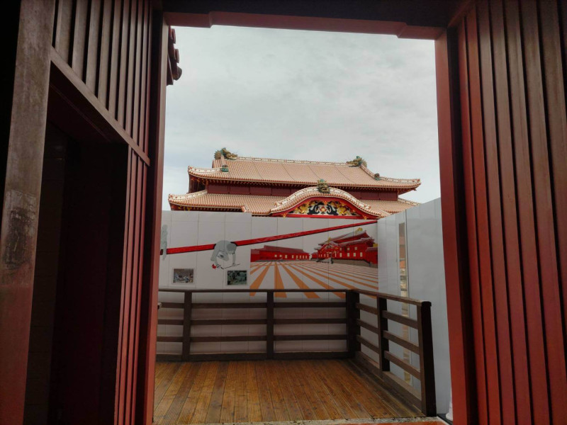 赤瓦が美しい屋根の上には、竜の装飾や、獅子が描かれた鬼瓦も設置されているそうだ。首里城公園で最も眺望がいい「東のアザナ」からの写真では、バックに沖縄の海を背負って、正殿が誇らしげに全貌を見せている。筆者自身も、正殿の焼失後に度々訪れて、この場所に立ったが、よみがえった正殿の姿には、写真とは言え、とても感慨深いものがある。城の周囲にある門の向こうに、正殿の赤い色の屋根が見える写真もあり、首里城全体の風景が“主役”の登場によって、一段と存在感を増しているようだ。