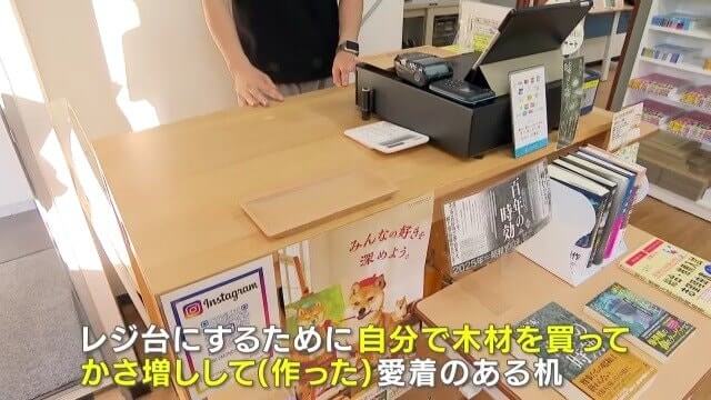 「これは、私が小学生の頃から使っていた学習机。書店のレジ台にするために、自分で木材を買ってかさ増しして(作った)愛着のある机」