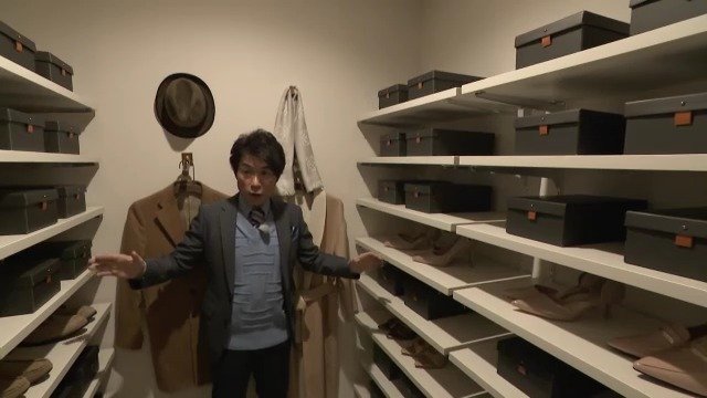 「エントランスは、広々としていまね。ここだけで畳半畳分あります。そこをあえて飾り棚にするんですね。もったいないですね…笑。こちらはシュークローゼット。両サイドに棚があって、靴は靴屋さんかというほど置けそうです。続いてリビング…ゴージャスで広々としています」