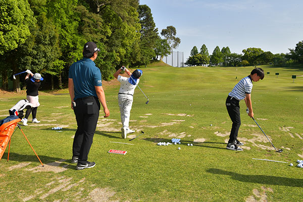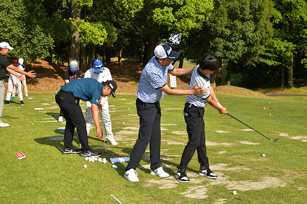 地元の小中学生を対象に、和合コースの練習場でレッスン会をおこないます。指導してくださるのは、この日のラウンドを終えたばかりの出場選手たちです。