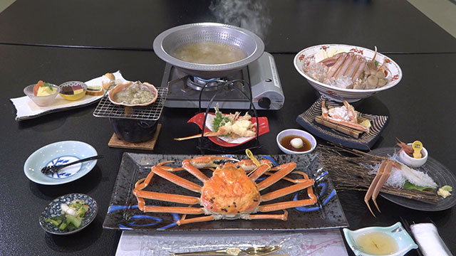 日本海の目の前にあるリゾートホテル。去年、客室の一部をリニューアル。冬の時期、一番人気のコースは1日30食限定の越前ガニの活ガニだけを使用した極魅コース。茹でたて400g以上とビッグな越前ガニが一人1杯。さらにカニ刺し、味噌甲羅焼き・焼きガニ・カニ雑炊と全てタグ付きガニを使用。