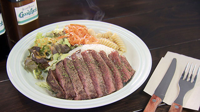 南知多町の内海海岸沿いにある人気カフェ「37CAFE」の敷地内に去年5月にオープンしたステーキダイナー。アメリカンな雰囲気が満載で看板メニューはレアステーキをたっぷり乗せた「ステーキオーバーライス」や本格的なスパイスカレー。