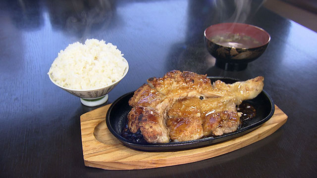 岐阜の名物グルメである「鶏ちゃん」に並ぶ新名物を作ろうと、タレに一晩漬けこんだ国産の鶏肉を丸ごと一枚、蒸しから初めて二度焼きにしパリパリに仕上げた豪快グルメ。