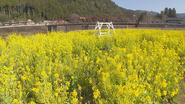 長良川沿いにある花畑。地元住民がお金を出し合って運営している。撮影スポットとして知られ、多くの観光客が訪れている。