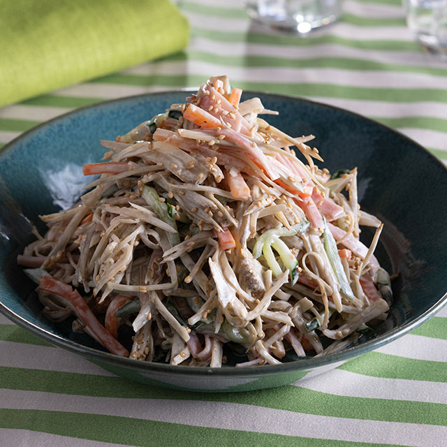 - 3の粗熱がとれたらマヨネーズ、炒り白ごま、練り辛子を混ぜ、きゅうりとロースハムを合わせて混ぜ合わせる。