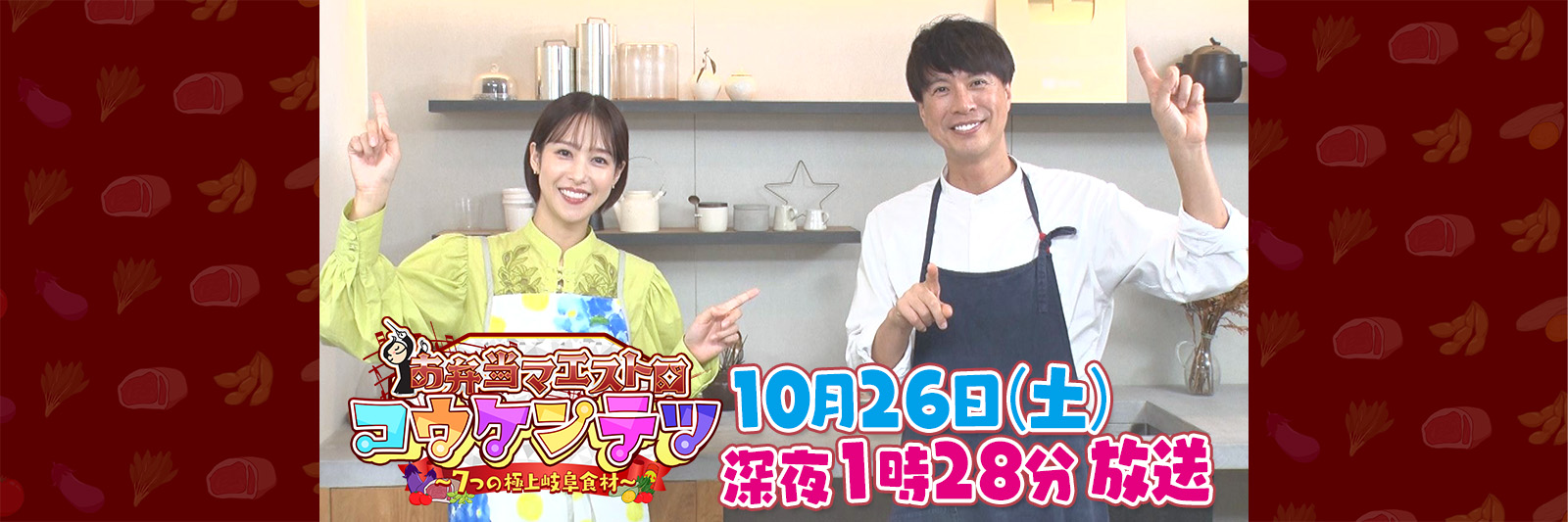 料理研究家のコウケンテツ氏が、岐阜県内で生産された7つの旬の食材を使い、7品の料理を作成。 最終的に、それら7品の料理を岐阜県の伝統工芸品である「飛騨春慶」に詰め込み彩り豊かなお弁当に仕上げます。 番組MCに、岐阜県出身で、手料理をインスタにアップするなど、料理の話題が豊富な鷲見玲奈さんをお迎えし、コウケンテツ氏の調理ポイントを押さえながらコウさんと共に番組を進行します。